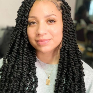 Shoulder-length twists with loose, curly ends. Usually, people that like dreadlocks, but want the flexibility of changing hairstyles, select Kinky Twists